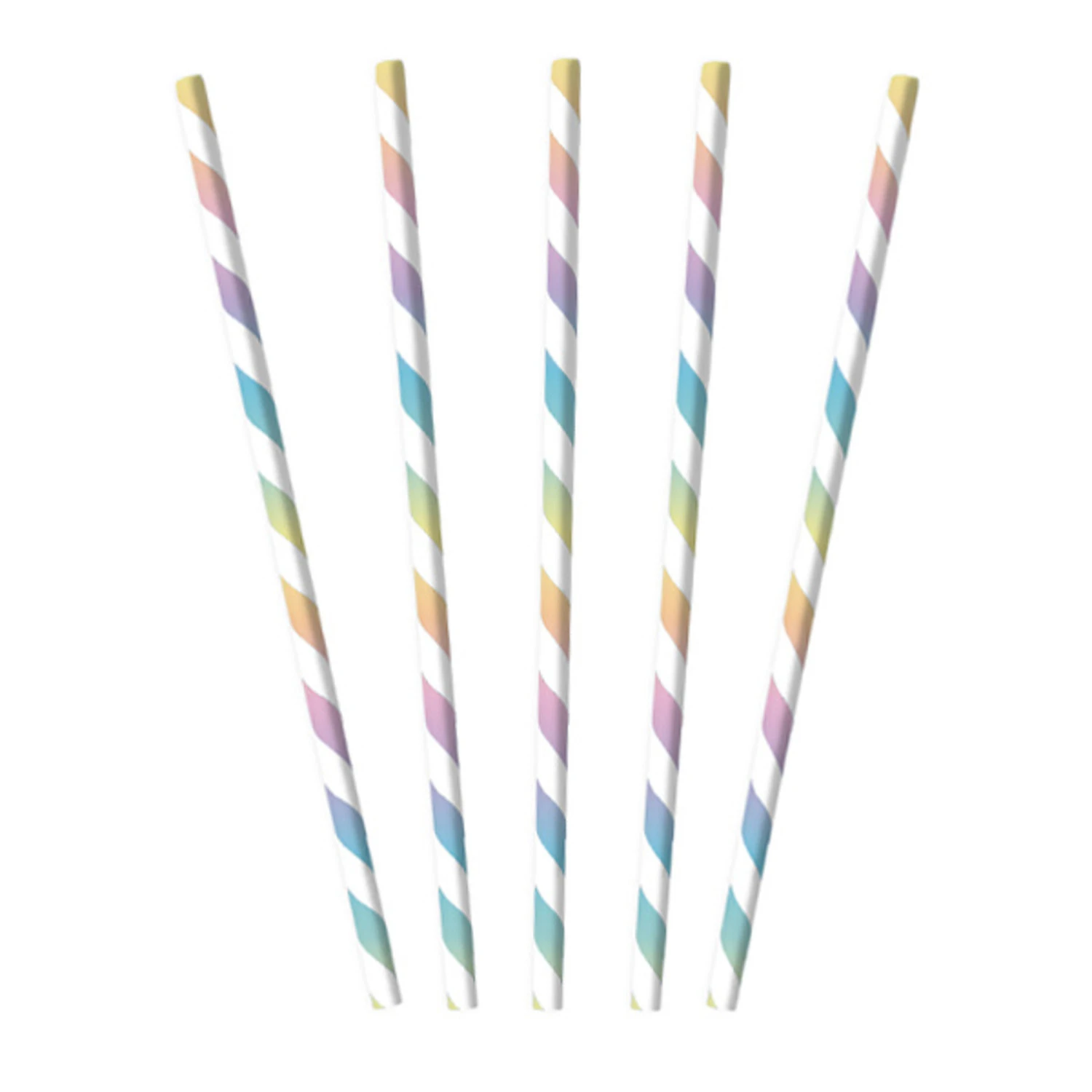 Deze papieren rietjes hebben een bijzondere uitstraling. De rietjes hebben strepen in verschillende pasteltinten zoals geel, paars en blauw met daartussen steeds een witte streep. Leuk voor drankjes in allerlei kleuren dus!