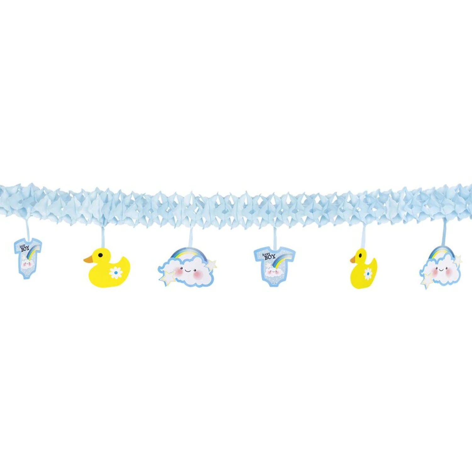 Het is leuk om te versieren wanneer je de komst van een baby viert. Voor een jongetje is deze papieren slinger ideaal. Aan de slinger hangen eenden, rompertjes en lachende wolken.