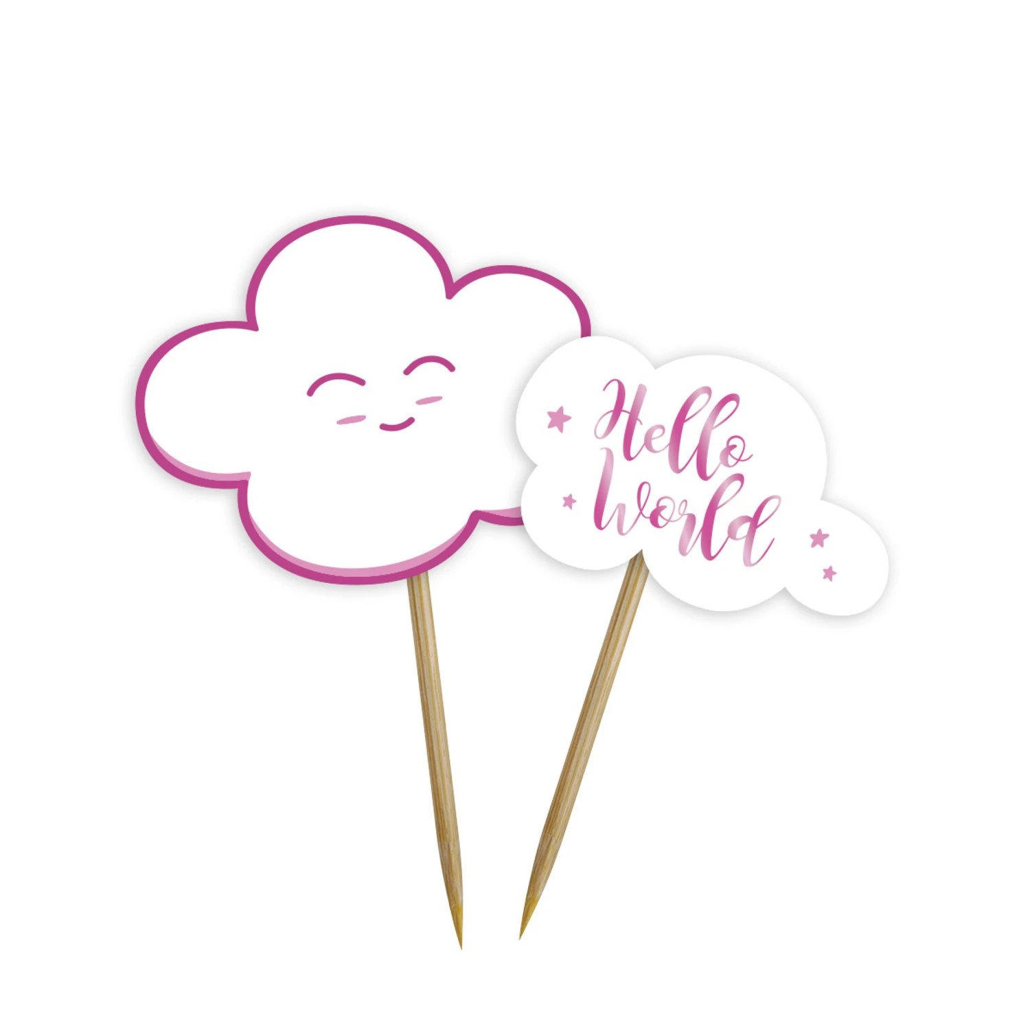 In je taart of hapjes kun je tijdens de babyshower leuke prikkertjes prikken. Je ontvangt 24 prikkers in twee stijlen: lachende wolkjes met een roze rand en wolkjes met daarop de tekst “Hello World”.