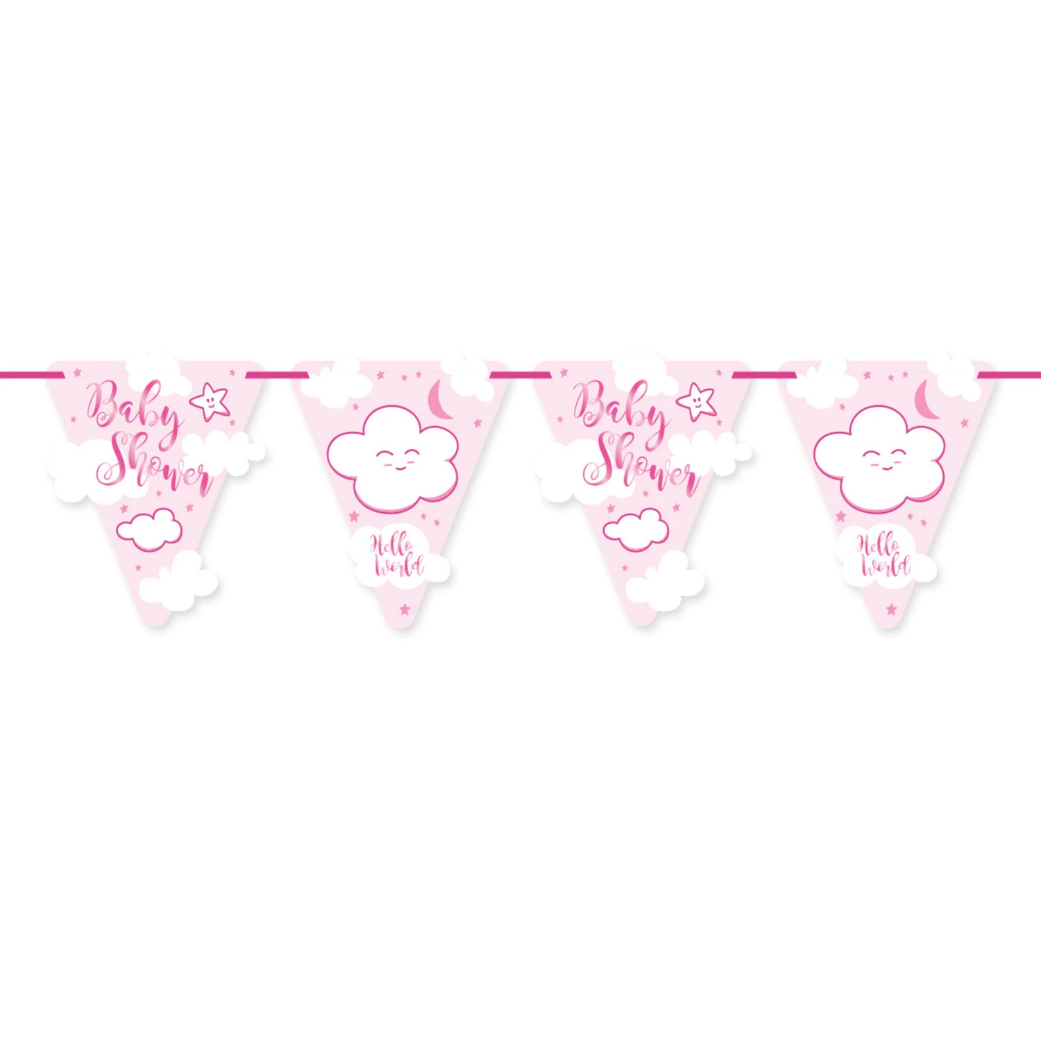 Voor een babyshower hang je vlaggetjes op. Deze feestelijke vlaggenlijn in de kleur roze is ideaal voor de komst van een meisje. Je ziet wolken, de maan en sterren op deze vrolijke vlaggetjes.